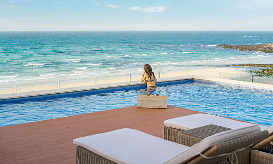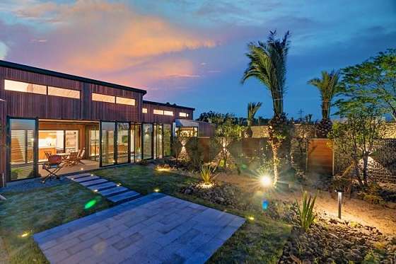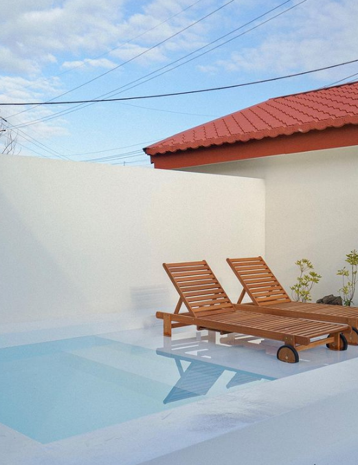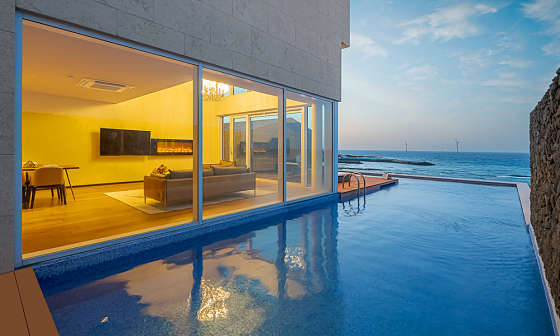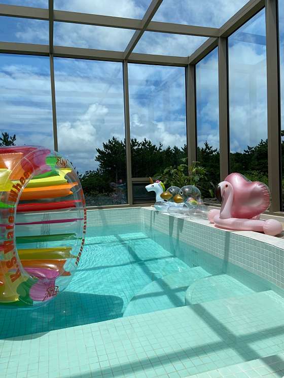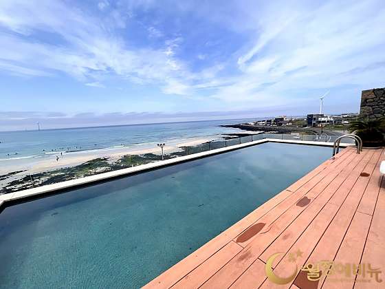 협재의 바다와 함께 프라이빗한 야외 온수풀을 즐길 수 있으며, 제주 한달 살기로도 인기가 많은 숙소이다.