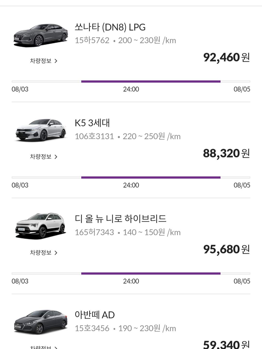 가격은 조이렌터카에서 참고한 것으로 소나타(K5)기준 1일 대여료 (10시간) 26만원 정도 이다.